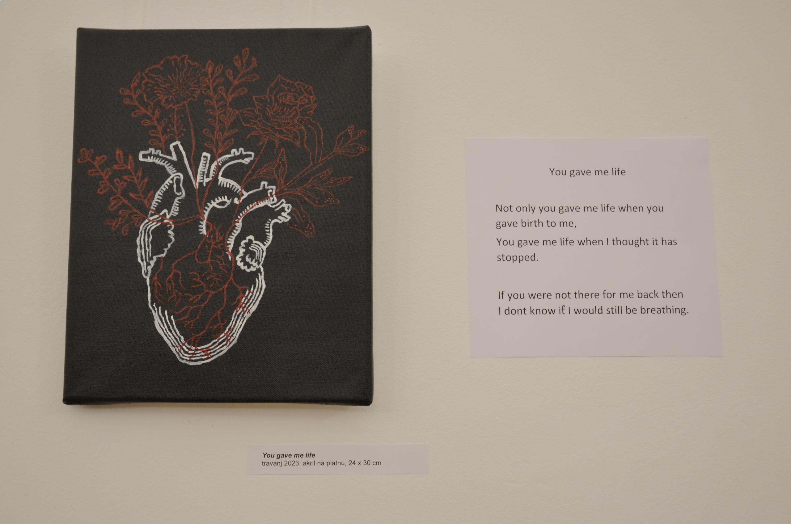 Izložba je zapravo pričica o periodu u mojoj prošlosti koji nije bio baš bajan, ali sam iz toga puno naučila i to me poguralo naprijed, da budem što pozitivnija i zapravo me usmjerilo u nekom pravcu u kojem želim ići . Zahvaljujući tome sam i sama shvatila tko želim biti i kako raditi na sebi. Naziv ‘ostala sam’ je tu jer sam često govorila da bih odustala. Podcjenjivala sam samu sebe u mnogočemu i uvijek bi mi misli naginjale ka tome da se maknem od nečega, da samo odem ili odustanem. Bili to hobi, škola, razna druženja, slikanje ili bilo što drugo. Danas je moje mišljenje drugačije i sretna sam zbog toga. – objašnjava nam Klaudija koja je veliku potporu imala u svojim roditeljima pa im je u znak zahvale posvetila sliku pod umjetničkim nazivom ‘You gave me life’. To joj je, kaže, jedna od najdražih na ovoj izložbi.